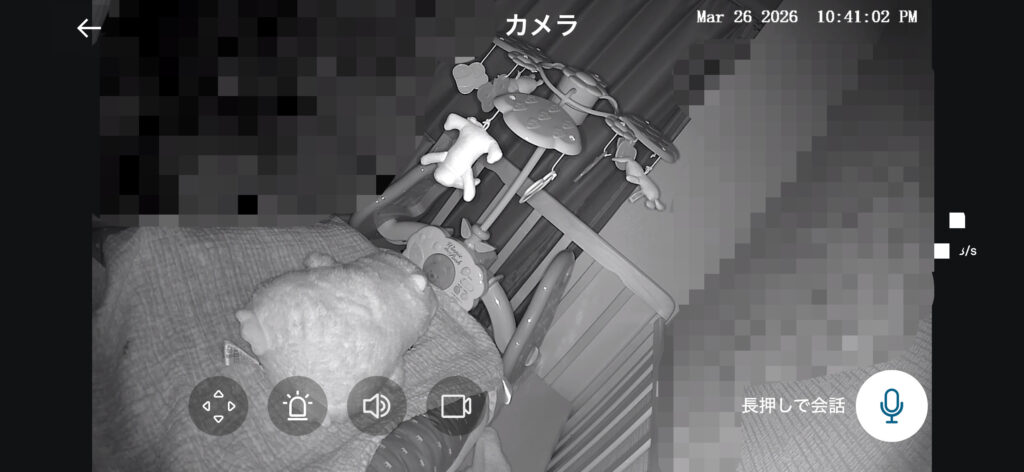 これがかなり優秀で、真っ暗でもはっきり映るので寝ているときの見守りカメラとして