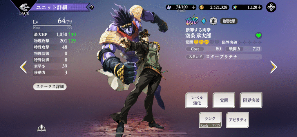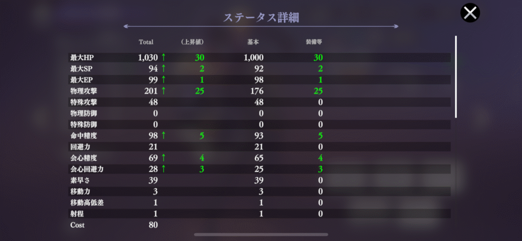 ユニットの強化をする画面で、左端にステータス詳細を見る事ができます。