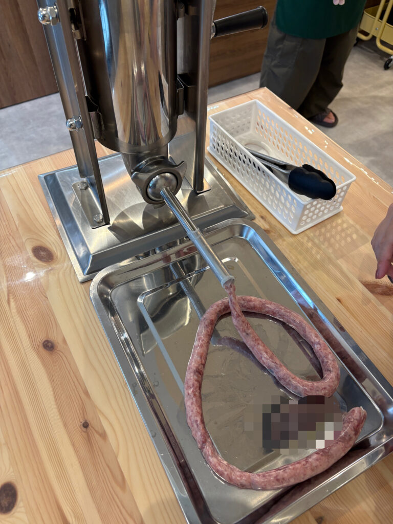 その後機械にセットして、グルグルとハンドルを回すとゆっくりとソーセージが出来上がります。