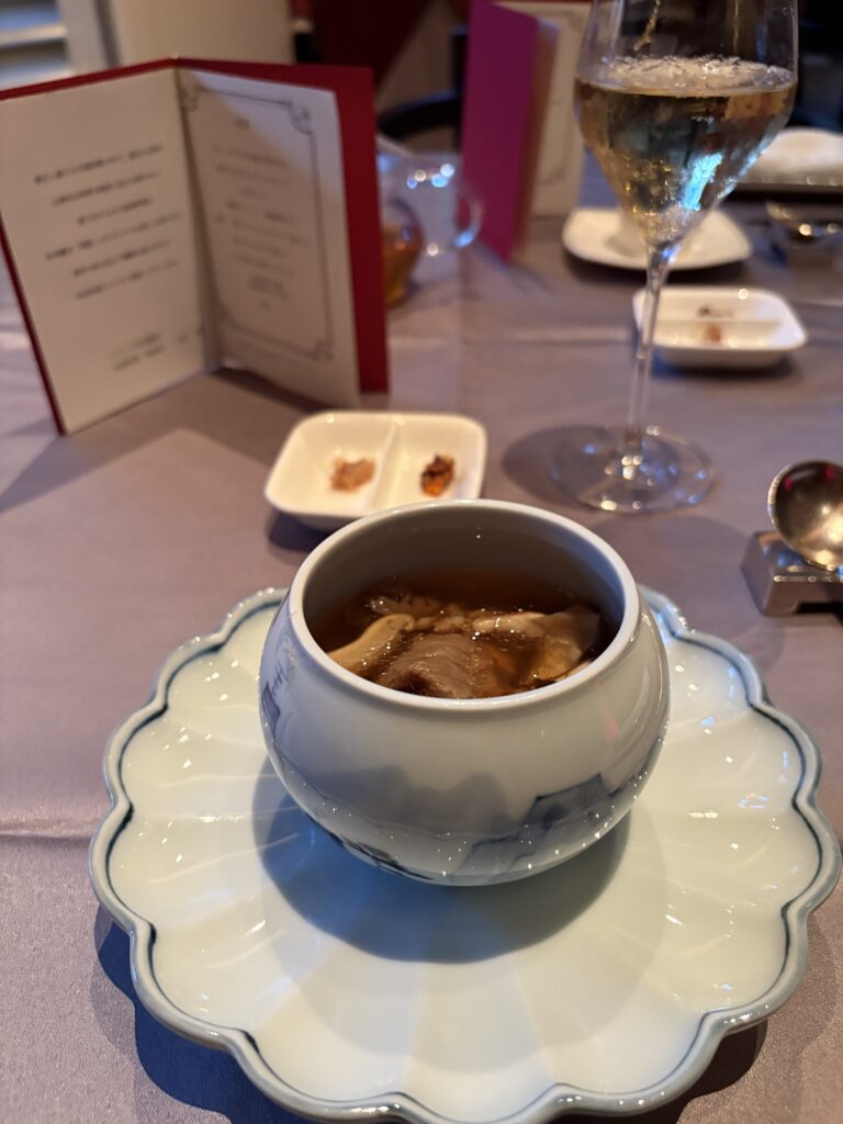 松茸と近江牛のスチームスープです。すごく上品な味がしました。松茸の匂いってこんな贅沢な感じなんですね。